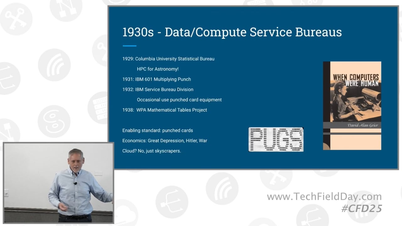 Tom Lyon begins by suggesting that if cloud computing is defined as outsourcing data processing to a company that owns the equipment, then the concept is nearly a hundred years old. He traces its origins to the 1930s, when IBM established service bureaus where clients could bring data to be processed using punch cards and tabulating machines, an expensive service akin to modern cloud offerings. This early period, marked by the Great Depression, saw basic arithmetic being outsourced, with computi